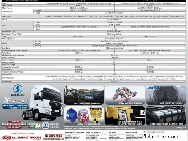 Shacman X3000 11-liter CUMMINS ISM CELECT 6-cylinder turbocharged Euro-4 Diesel engine, 385 horsepower, 1,825 N-m torque, 12-speed manual transmission, 6-wheeler 4x2 rear wheel drive, 600 liter aluminum fuel tank, 430 mm diameter EATON clutch, SHACMAN-Hande Axles, 12R22.5 (6+1) tires with rim trim cover, multi-leaf spring suspension, WABCO braking technology, length: 6,825 mm, width: 2,490 mm, height: 4,000 mm, wheelbase: 3,175 mm + 1,400 mm, Gross Vehicle Weight: 18,000 kgs, Curb Weight: 9,500 kgs, Gross Combination Weight: 40,000 kgs, high roof, double sleeping beds, four-point air suspension, air conditioning system, Grammer air suspension driver seat, HID headlamps with Adaptive Front Lighting System with LED Daytime Running Lamps, Jost fifth wheel, Cruise Control, Fleetguard air filter, electrical cab reversal, central door locks, electric heater side mirrors, SHACMAN telematics; 12-months unlimited mileage new vehicle warranty.